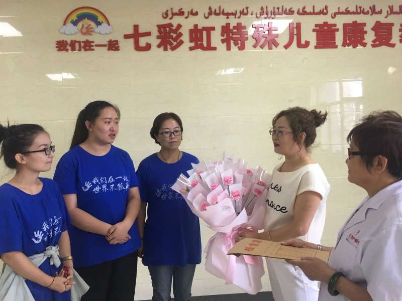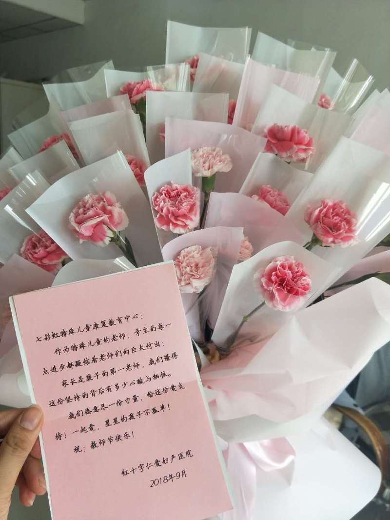 “作为特殊儿童的老师,学生的每一点进步都凝结着老师们的巨大付出;家长是孩子的第一任老师,我们懂得这份坚持的背后有多少心酸与牺牲。我们愿意尽一份力量,给这份爱支持!祝老师们节日快乐!”。9月7日教师节前夕,仁爱医院党支部书记,把鲜花和《健康体检表》交给七彩虹特殊儿童(自闭症)康复教育中心。